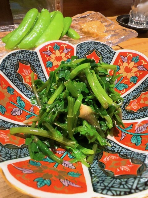 箸休めは季節のもの、ふきのとう味噌に花わさびの醤油漬け。新物 木更津産海苔炙りのサービス。