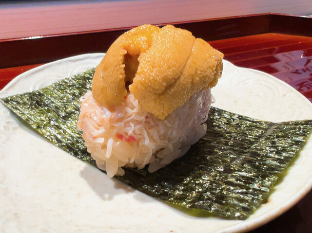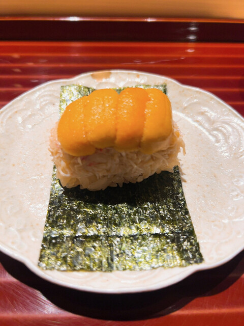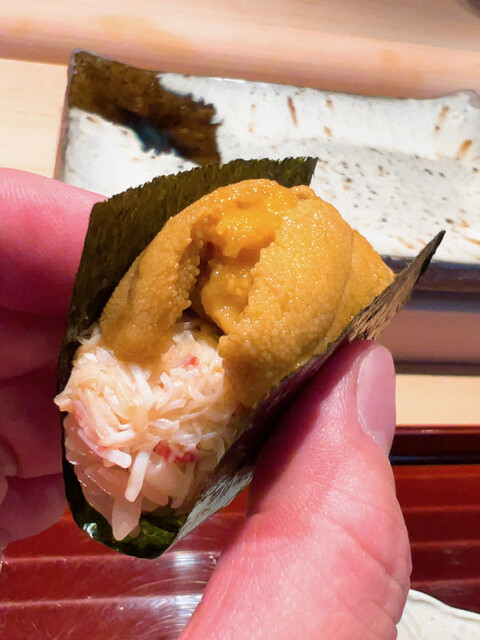 後半にお寿司タイム。握り九貫に手巻きと玉子焼き、追加でニ貫一巻をいただきました。流石に追加分の赤酢は響きましたが、とても美味しかったです。