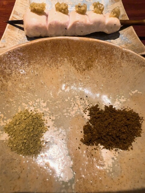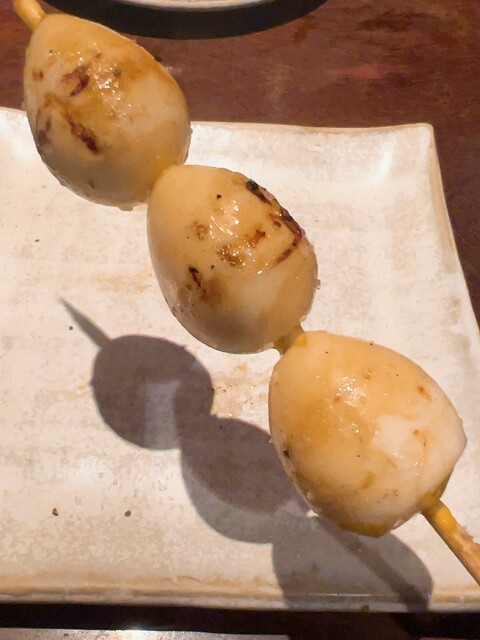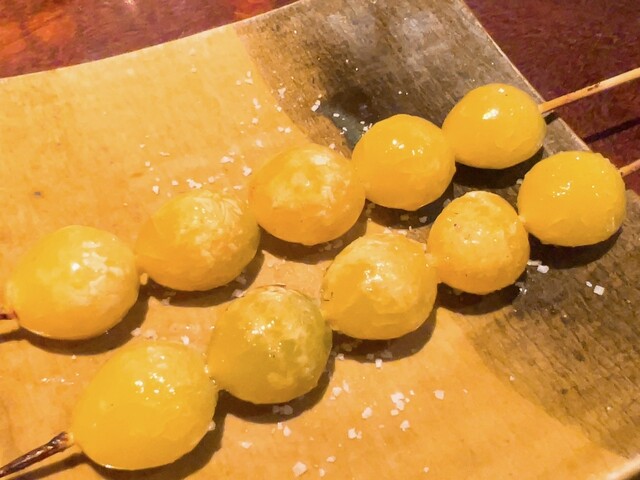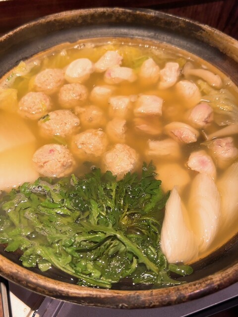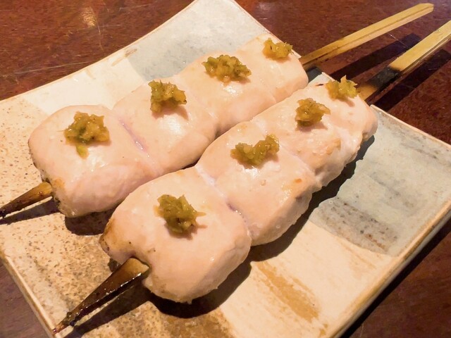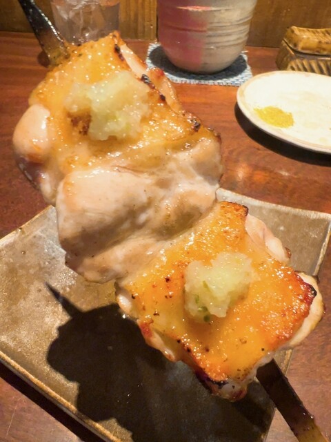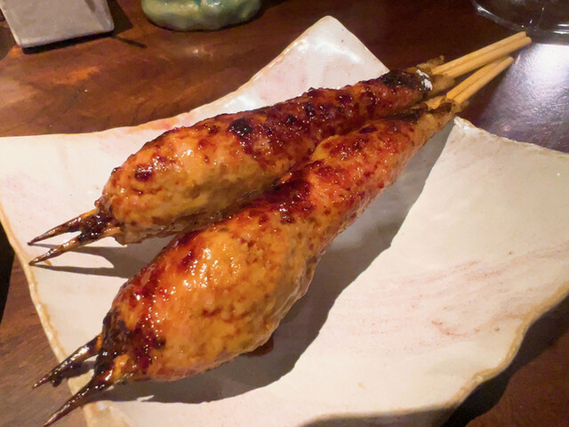 こだわりのホロホロ鳥・軍鶏・鴨を最上級備長炭の強火で焼き上げる絶品串焼き、丸で仕入れるからこそ可能な希少部位や熟成、焼きのこだわりは肉に限らず、全国津々浦々こだわりの野菜も絶品、全部美味しかったけど、今日一は、ふりそで、椎茸が特に心に響きました!同じように見えて微妙に変化するお料理のながれ、出し手と受け手のキャッチボールが楽しいです♪前回との差異、海老芋真丈、菜の花お浸し、最中リエット、鬼おろし鶏皮ポン酢。