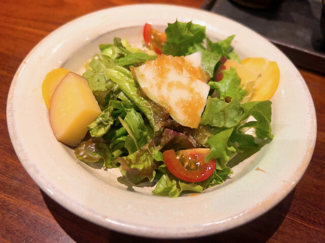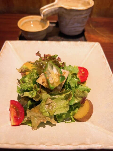 先ずはおもてなしの温かい汁物と3種盛りにこだわりの生野菜サラダで準備体操