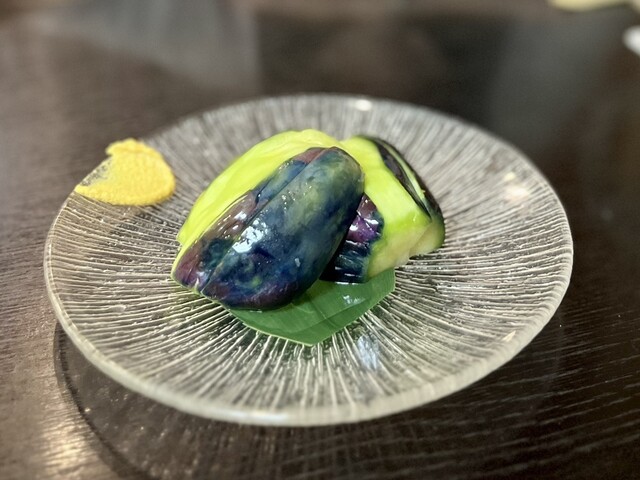 八寸は、サワラの柚香焼き、ゴボウモチ、イカのワタ、ミョウガ、ホウズキ。ゴボウをすったものを白玉粉で練ったゴボウモチはモチモチで、ゴボウの香りがよく立っています。これはうまい。ホウズキも果物のようです。