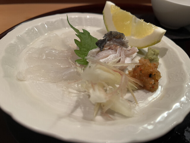 この日はヒラタケと炙った湯葉にセリを載せた椀からスタート。香りとセリのしゃきしゃきした歯ごたえがいい。お凌ぎの握りはコハダと炙ったキス。この握りがいつも楽しい。