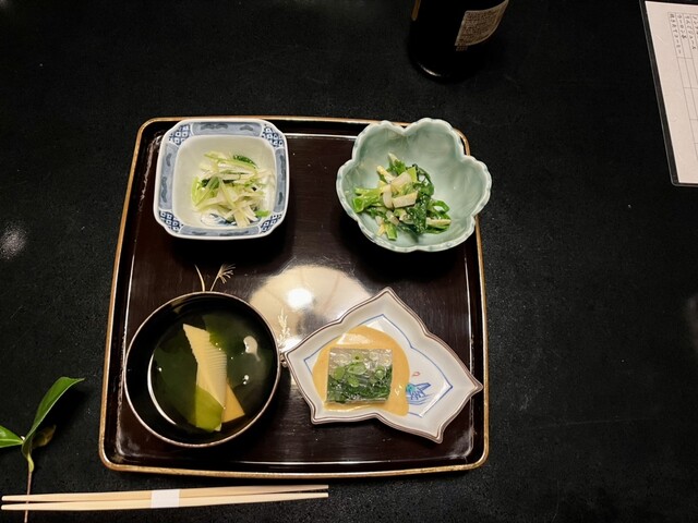 料理のスタートはお盆の4品。昆布の出汁がきいたタケノコの椀、みつばのお浸し、ホタテとうどの酢味噌和え、うるいと菜の花のゼリー寄せです。どれも絶品。酢味噌の酸味がほど良いバランスだし、それぞれの山菜の本来の味が生かされている。