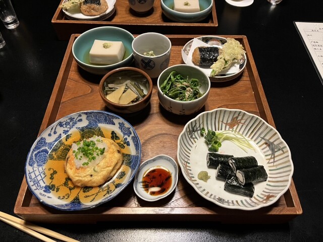 次は7品が載ったお盆です。自家製でピリッとする柚子胡椒を載せたがんもどき、粘りの強い自然薯の磯辺巻き、地元では「木の芽」と呼ばれて山菜の王様とされるアケビの新芽、タケノコとワラビ、擦ったレンコンの揚げ物、フキノトウの胡麻和え、舌に吸い付くような胡麻豆腐。とてもシンプルなのに、驚きの味。