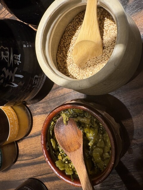 ご飯、キャベツ、赤出汁はお代わり自由。食後のコーヒーもセルフで自由。高菜漬けもたっぷり。