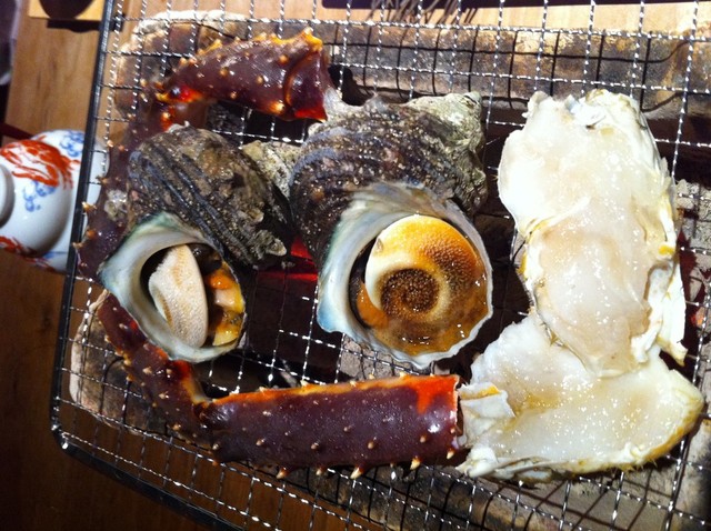 たらばとさざえ 網で焼きます。 海の香りが楽しめます、、しかし、竹崎蟹の後ではたらば蟹は太刀打ちできてません (^^)