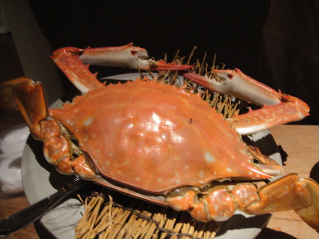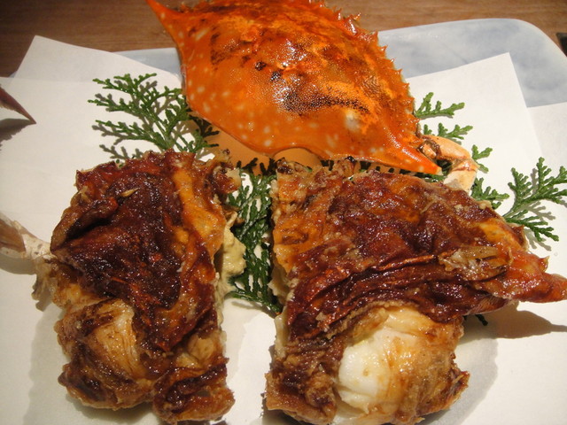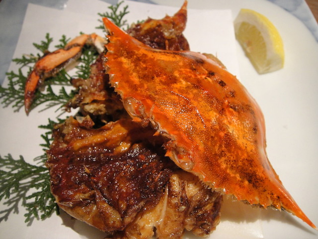 ここで!出ました!![b:脱皮蟹の素揚げ♪] 脱皮した直後の蟹をそのまま油で揚げた料理です。。