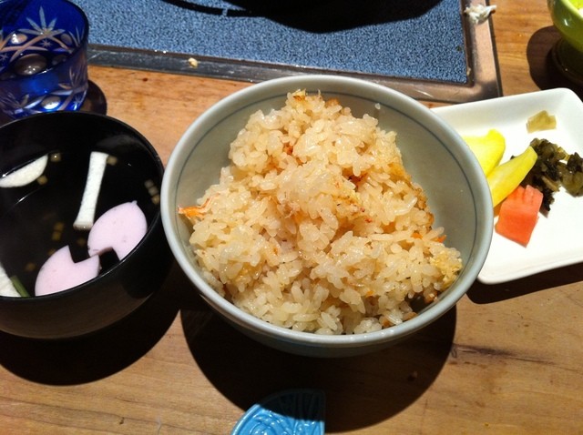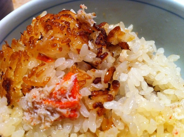かに釜飯 これも細かい心くばりを感じます。わざとお焦げを隠して茶碗にもっていただけます♪ 食べながら あっおこげ!という感動を演出しているのでしょう。。担当スタッフさんにそれを言うとニコリとされてました。。。(^^ゞ おこげうまっ!これだけ食べてもお箸がススム君です。。