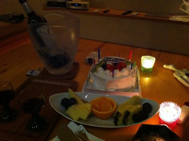 お部屋に戻ると 同伴者へのメッセージ付きのケーキとワイン!そして蟹御殿さんからの花火付きのフルーツ盛り合わせをセッティングしていただいてました。 部屋に備え付けのプレーヤーで音楽も。。ハッピーバースディ!