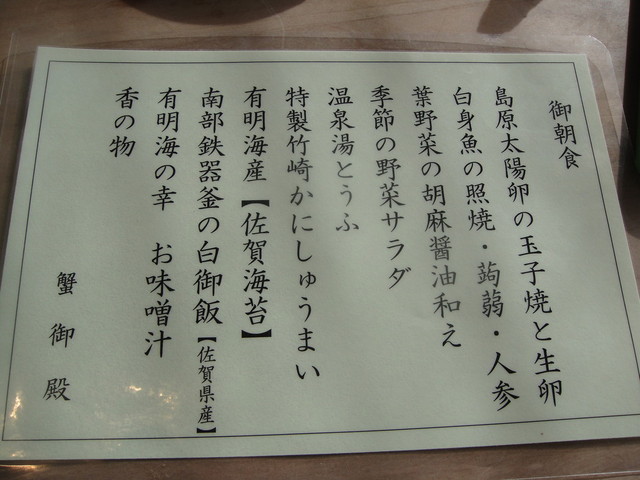 実家の佐賀では有名店です、毎年行ってます。当然いろんなプランがあるのですが、やっぱりメインの蟹は絶品です。竹崎蟹は味噌がとても濃厚なので蟹好きにはたまりません。焼酎とカニみそ・・・温泉入ってカニ食べて、食事も露店も海をみながらのんびりとした時間を過ごせます。朝食も炊きたてのご飯がススム君です。去年は和室の露天風呂付客室に泊り、今年は新しくできた露天付きのはなれに泊ったのですがはなれより和室のほうが好評でした。やっぱ部屋の広さは大事ですね。また冬に行きたいと思います。
