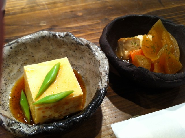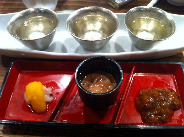 飲み比べセットに付いているのか?あてセットを出していただきました、生カラスミ、イカの塩辛、梅クラゲの三種、個人的に日本酒と梅クラゲはいまいちでした。酸っぱいのは得意ではないです (^^ゞ 生カラスミが特に美味しでした。