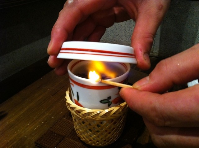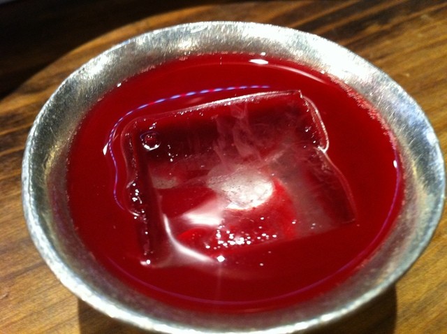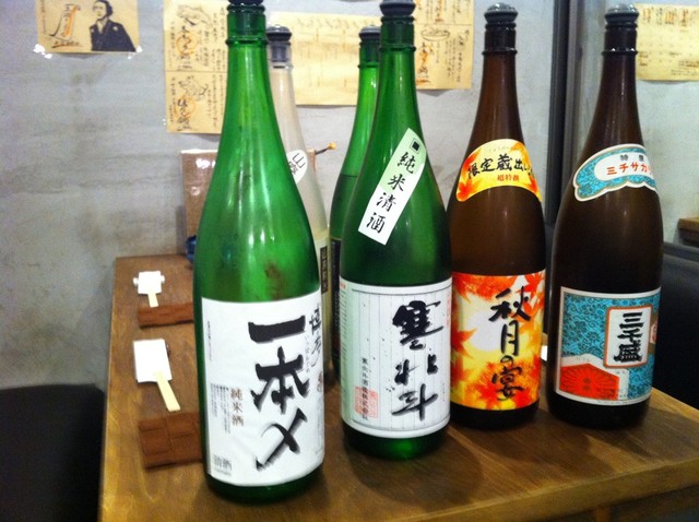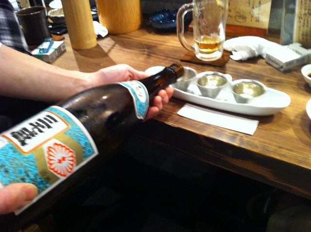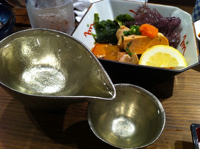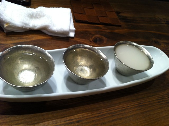 日本酒飲み比べ うれしかったのは鈴でできたおちょこ、ひんやりとして陶器とは違った味わい、いい感じです。日本酒は月替わりで6種置いてありました、同伴者と私で2セット、前種飲みました。 うーん できれば定番の日本酒も置いといてほしいです。