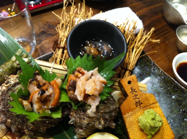 初めてなのでビールと刺し盛りを注文。新鮮でうまし、何故がヒアルロンサンゼリーなるものも付いてきました。これは同行者にあげました。 車エビと1口鮑は活きていました、海老は後でからあげでいただきました。