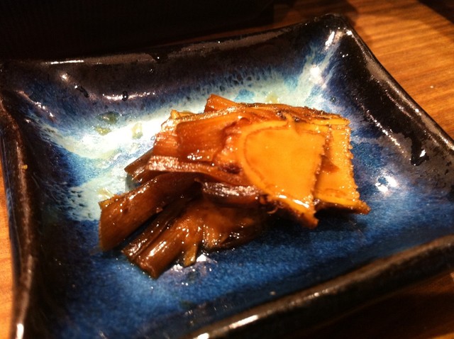 生ワサビの茎と魚の醤油漬け メニュー名が正しいかわかりませんが今回の大当たりメニューです。あてにぴったり、茎ワサビの