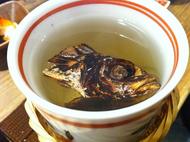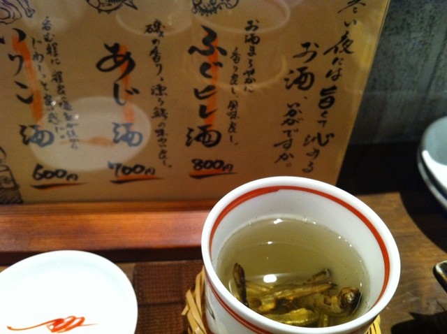 あじ酒 うま味がすごい!小アジ一匹入ってます、臭みは全くなく、鯵のうま味と風味がお酒に・・・つぎ酒含めて私3杯、同伴者も2杯いただきました、どハマリしてしまいました。まいったねこりゃ(*^^)v