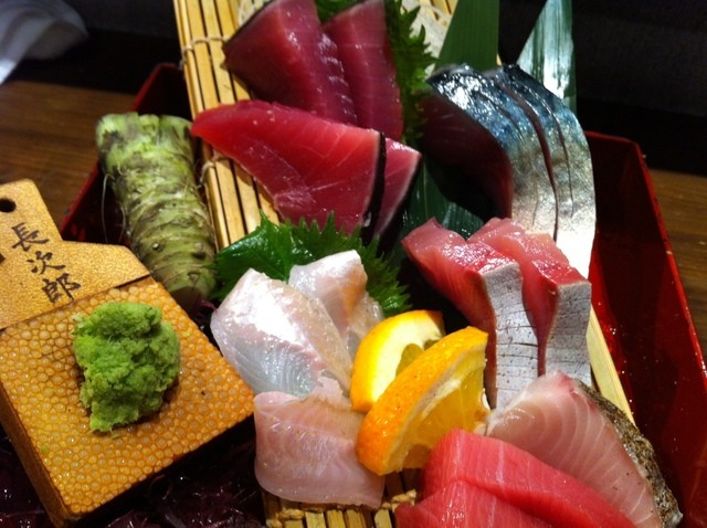おまかせで刺し盛り♪ 鯖・鰹・穴子・カンパチ・中トロ・・十分です!私お気に入りのすりたてワサビでいただきました(^-^)v