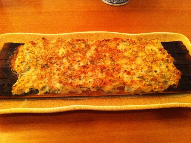 つくねの杉板焼き おそらく杉板の上にすり身をのせて焼いたのだと思うのですが美味しい!ふんわりとしたつくねの中に軟骨のコリコリとした食感があり病みつきになりそうなやさしい味でした♪焼酎にもビールにもあうあうです(^◇^)
