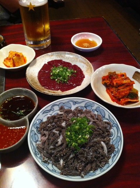 必ず注文するのは牛タン、レバ刺し、センマイ刺し、白菜キムチ。キムチは自家製で新鮮さを感じる本当においしいと感じる