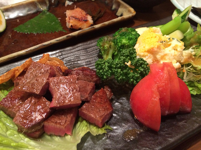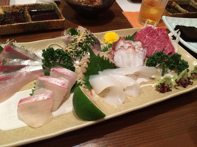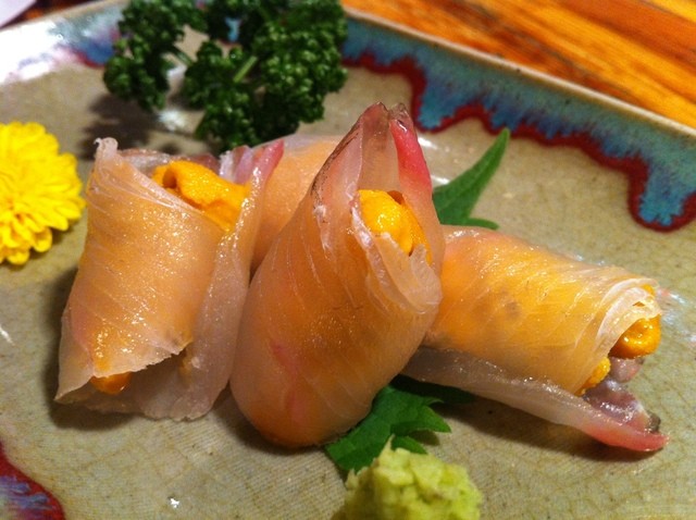 旬の刺し盛り うーまーいー!鯨が特に美味しい♪よく食べるのですが全く別物のように癖が無く脂が甘い!そのほか平目、雲丹、鯵、蛸等・・白身はしっとりとした食感で魚の本当の甘みを堪能した気がします(^^) ウニを平目で巻いたお刺身は追加しちゃいました(*^^)v