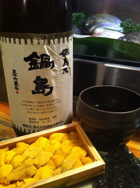唐津産雲丹♪お店の方がそろそろ雲丹も終りの時期なので・・これからしょっぱくなっていくからね~ということで!数枚ある板雲丹からこれぞとおすすめの一枚を出していただきました!それに合う日本酒ということで・・・でたっ!鍋島大吟醸ヽ(~~~ )ノ