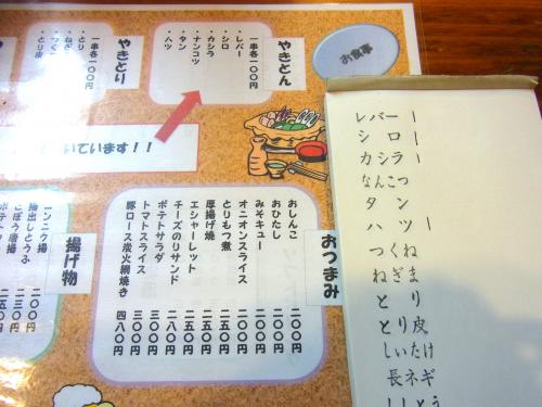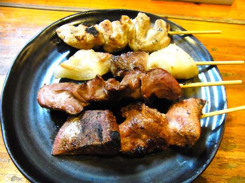 やきとんは各100円、紙に書いて渡す方式です。レバー、シロ、カシラ、ハツを各1本、オール塩でお願いしました。