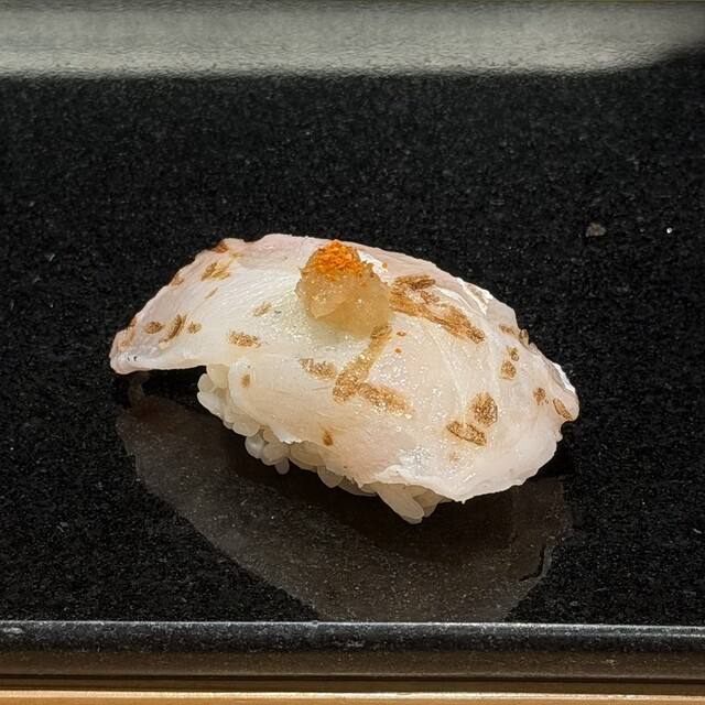 ・穴子です。って言われていつもと違うビジュアルで戸惑うと、食感がいいので是非と。少しだけ炙った香りと身が絞まる感じがコリコリより少ししっかりした歯応えでとてもおいしかった。