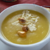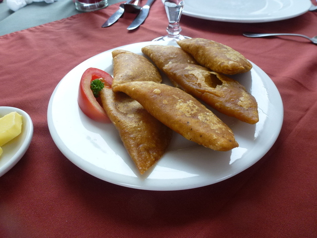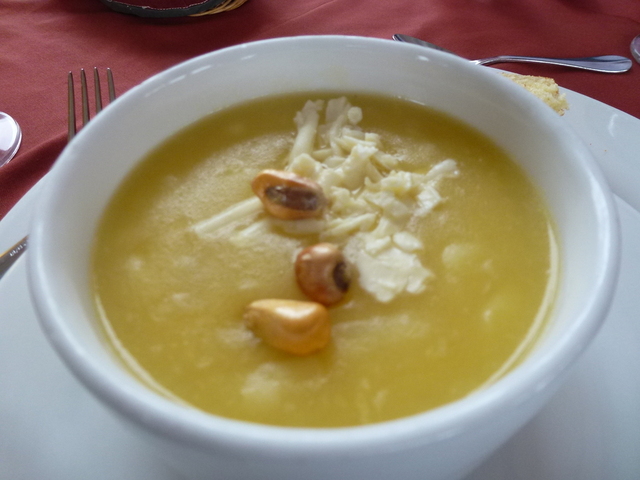 写真の3枚は初めての夕食です。前菜は餃子に似ていますが、揚げたもので中にはいろいろなものが入っていました。名前を聞いたのですが、覚えきれませんでした。次はスープです。トッピングはコーンとアボガドです。