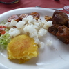 メインは豚の揚げたもの、コーン、ポテト、焼バナナと付け合わせの野菜です。これにパンがつきました。