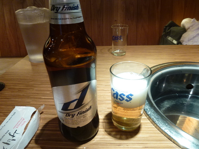 まずビールで乾杯です。いつもはハイトビールかカスビールですが今回は初めてのビールです。これはドライで日本のスーパードライとそっくりの味です。私の好きな味でした。