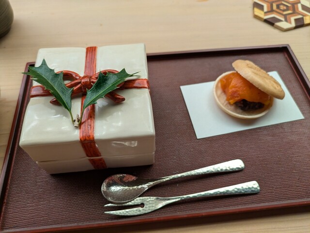 いつも通り2人で予約をして伺いました。先付けはセコ蟹と糸状に切ったリンゴです。これが相性が良く両方のうまみを増強させています。おいしいですね。お椀は蕪の、みぞれ餡仕立てでした。お造りは2皿出ました。鯛ともう一皿は鮪と烏賊と車エビです。次は年越しそばの意味でしょうか、十割そばが出ました。とろろ仕立てです。この後は八寸です。鯖寿司や雲丹がトッピングされた蟹などです。次はシシャモの焼き物が出ました。最後は鴨のつみれ鍋です。食事は帆立ご飯でした。