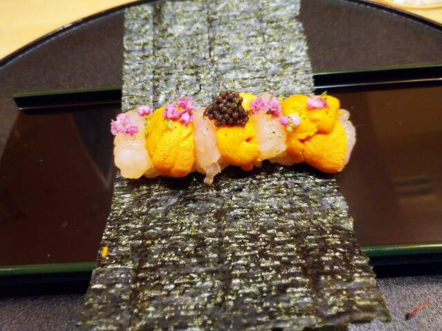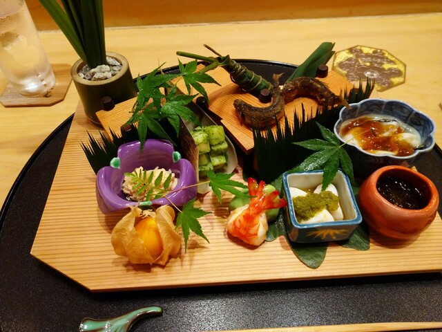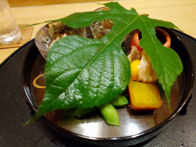 いつも通り予約をして2人で伺いました。ハートランドビールからです。先付が出ました。湯葉、じゅんさい、車海老、雲丹、オクラにジュレがかかっています。美味しいですね。いつも先付が楽しみです。お椀は海老真丈と冬瓜です。出汁が抜群の美味しさです。鱧の湯引きが出ました、身が厚くふんわりしています。淡路の沼島の鱧だそうです。日本酒に変えます.最初は黒龍の「火いら寿」から14代の秘蔵酒などをいただきました。次はお造りです。鮪、しまあじ、烏賊、あこうです。八寸は梶の葉で飾られています。穴子の棒寿司など酒の肴が満載です。アユの塩焼きが出ました。頭から戴きましたがこの大きさが、頭も食べれる限界ですね。美味しいです。この後甘エビと雲丹にキャビアがトッピングされた手巻き寿司と和牛のローストなどが出て食事は鰻ごはんでした。これもおいしいです。デザートは果物のゼリー寄せで和菓子は葛きりでした。最後に薄茶をいただきます