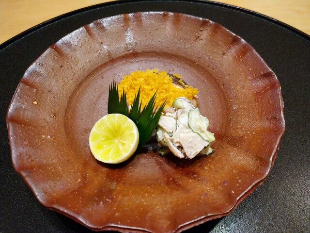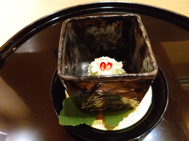 先付が出ました。ごま豆腐と焼きナスに雲丹が載せられジュレがかかっています。この店の先付はいつも美味しいので楽しみです。次は果物の白和えでした。今月はお椀代わりに土瓶蒸しです。鱧と岩手県産の松茸でした。三つ葉が入っています。個人的には土瓶蒸しではこの組み合わせが一番好きです。海老やほかのものが入っていないほうが好みです。
