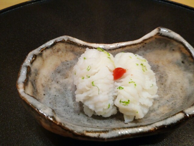 いつも通り2人でやってきました。今回の先付は秋刀魚です生ですがゴマ油で処理してあります。今年初めての秋刀魚です。今年は大漁になればいいですが。次はシャインマスカットなどのフルーツの白和えです。これは美味しいです。土瓶蒸しが出ました。やはり鱧と松茸の土瓶蒸しが一番好みです。色々なものが入っているのは好みません。お造りは甘エビ鯛の昆布じめ、剣先烏賊、トロの握りでした。次は八寸です。イクラ、雲丹、銀杏。カマスの押しずしなどです。どれも美味しいですね。