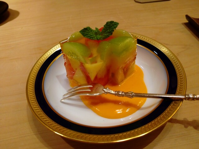 この後果物のゼリー寄せが出て、自家製の和菓子の後は薄茶です。美味しくいただけました。