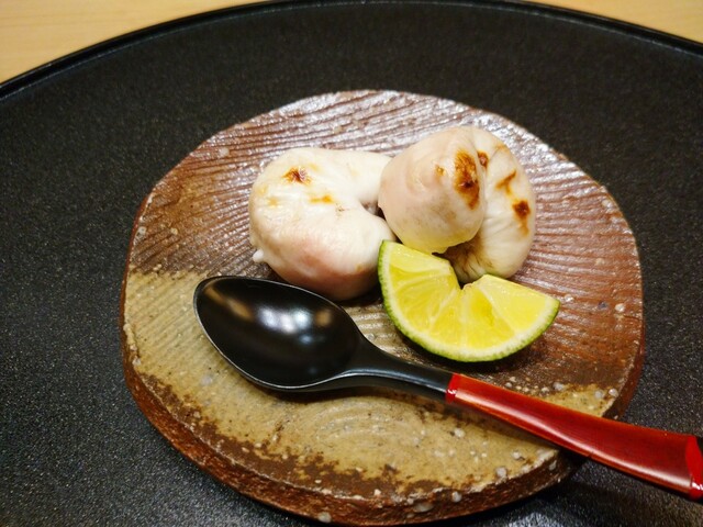 次は蒸し鮑と雲丹です。昆布の香りがして美味しいですね。河豚の白子が出ました。何とも言えぬ抜群の美味しさです。