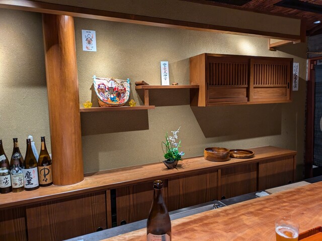 一階のカウンター席に案内されました.2階にも席があるようです。まず瓶ビールからにします。先附はうすいエンドウのお餅風のものです。ジュレがかかって,えんどうの香りもほのかにあり美味しいです。2品目は河豚の白子の鮨です。お椀は蟹しんじょうで出汁の味も抜群です。お造りは2品出ました。フグと烏賊雲丹です。飲物は「魔王」のロックに変えました。焼き物はヒメマスとホタルイカです。この後車海老とうるいなどの山菜が出て最後は和牛のフライでした。食事は金目鯛の炊き込みご飯とカレーライスの2品が出ました。食事は両方とも美味しくいただけました。
