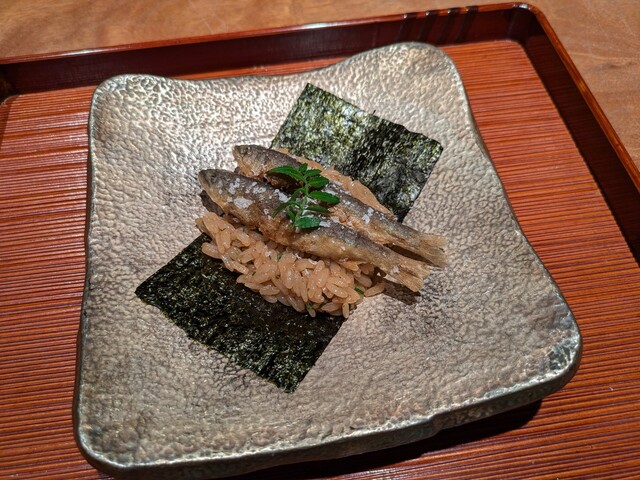 稚鮎の手巻き寿司が出ました。先日別のお料理屋さんでも同じものを食べました。流行っているのでしょうかね。