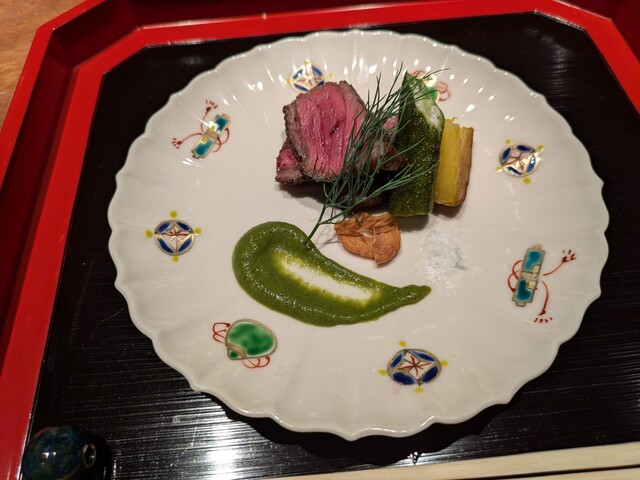あぶらめに山菜ががトッピングされています。出汁も抜群の美味しさです。この後お造りが2種類出ました。最初はカツオです。二皿目は金目鯛です。どちらも美味しいです。この後桜マスの焼きもの、北寄貝そして最後は淡路産の和牛のソテーです。これは柔らかく脂ののりも丁度よく美味しくいただけました。食事は2種類ありホタルイカのお炊き込みご飯とカレーライスです。