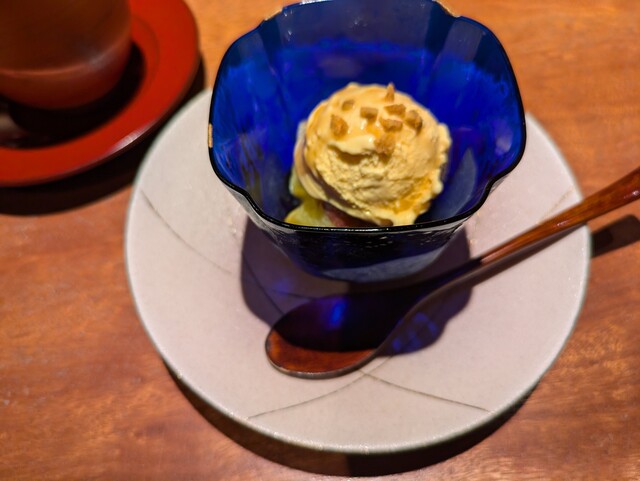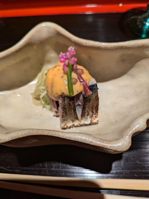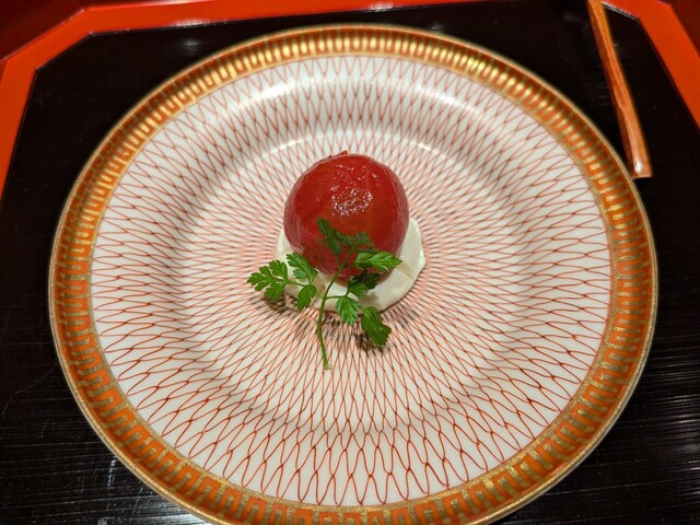 先附は焼きナスの豆腐に雲丹がトッピングされています。茄子の香りがほのかにして美味しいです。