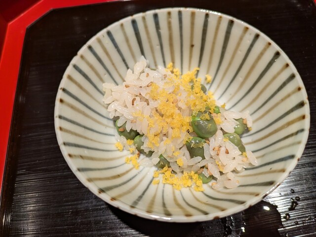 今回は家族3人で伺いました。それぞれ好きな飲み物にします。まずはビールで乾杯です。やはり暑い日のビールは格別ですね。先附が出ました。だだちゃ豆のすり流しに蟹の餡がかかっています。これは抜群の美味しさです。次は鱧と松茸ですがリゾット風の感じです。松茸の香りがいいですね。お椀は春子と焼き蓮根です。これも出汁の風味が鯛の味を引き立てています。