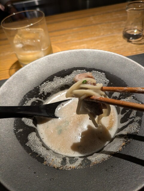 前回お料理が抜群の美味しさだったので再訪しました。今回は私はウイスキーとのペアリング相方はワインとのペアリングにしました。最初はシャンパンで乾杯です。アミューズは鰻とズワイガニです。美味しいです。ウィスキーはお料理に合ったいろいろな飲み方で提供してくてます。ほとんどがスコッチのシングルモルトです。2品目は鰆ですこれも美味しいです。3品目の秋刀魚と里芋の茶わん蒸しは今まで食べたことのない食感で抜群の美味しさですね。次のアワビのリゾットも何とも言えぬおいしさです。この後、金目鯛やカモのローストが出て食事は鴨のラーメンです。どれも美味しくいただきました。ウイスキーはどれも美味しいです。相方もワインのペアリングに満足していました。