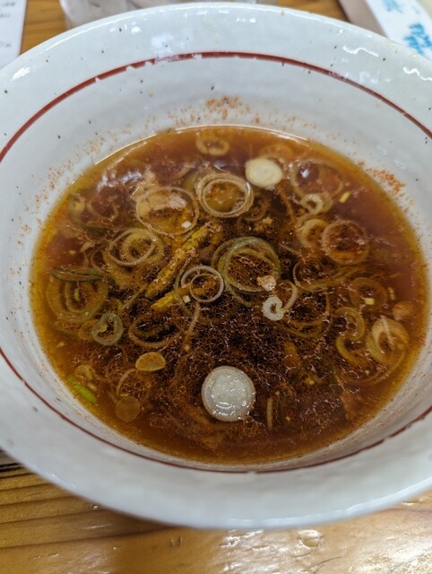 半分程食べた頃に玉ねぎの粗みじん切りを加える。玉ねぎに熱が入ることで、甘さが加わりスープは更にマイルドに。シャキッとした食感はサッパリ系へ変え、新たなとらの一杯を作り出す。最初からやるのも悪くはないけど、様々な旨さを楽しむために途中で加えてます。是非やってもらいたい。