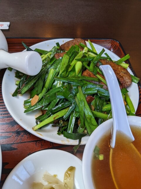 シンプルにニラとレバーのみ。スープとライス。早速いただく。味付けはオイスター系の甘さにニンニクチップが最高。僅かにピリッと引き締められた味がご飯にとても合います。