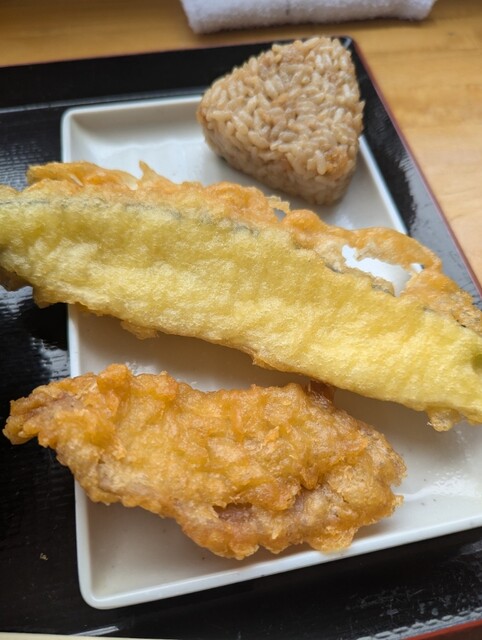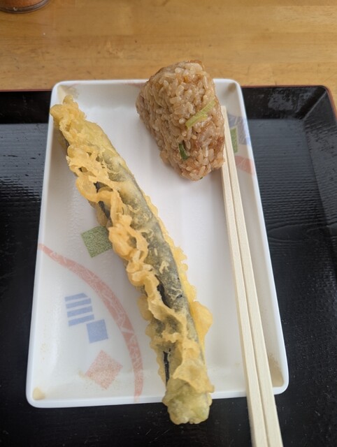 巨大なちくわ天は、本場四国から取り寄せしているとのこと。ムチっとした弾力が強烈で、外側のカリっとした衣が美味い。とてもオススメです。因みにあのチェーン店では一本150円ですからね。これだけでもここのコスパの良さが分かる。もう一つはなす天。これも大好きな天ぷら。カリっとした衣の中から、トロッとしたなすが出てくる。醤油で食べても美味いし、このイリコスープに婬しても美味い。炊込のおにぎりも悪くはないけど、冷たいのでせめてレンチンしたいかな。