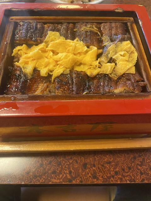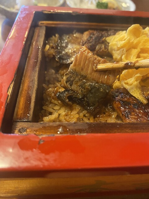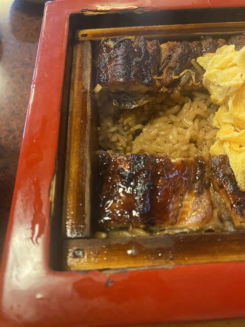 せいろは赤い重厚な物で、端にうなぎが並べられ、その間に錦糸卵が横たわる。