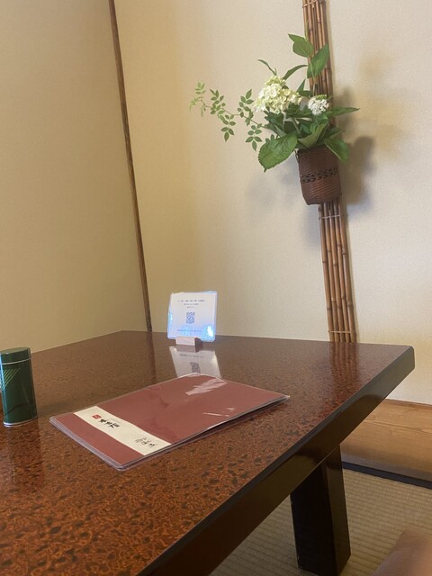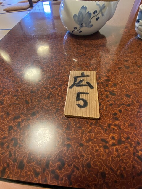 卓上には木の札が置かれていて、この座卓の分には「広5」と書かれていた。