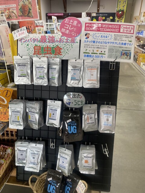 店内に入ってみると、そこでも昆虫食が販売されて、アルミのパックになってフックに掛けられていた。