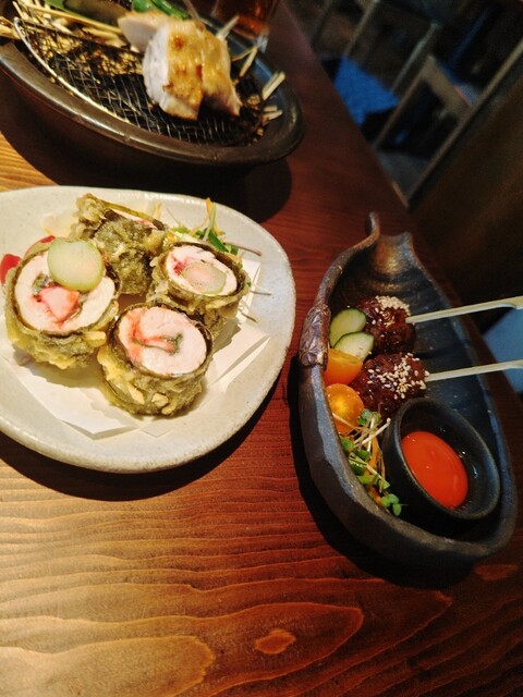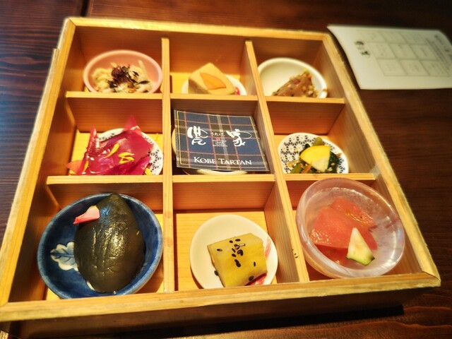 お通しが9マスの器に8品のお惣菜少しずつ小皿に。720円でお通し?と思いましたが美味しかった。秋の収穫祭で地産の野菜を好みの調理法で出してくれるので白茄子の田楽をお願いしました。茄子がトロトロ。淡路どりの藁焼き、淡路鶏むね肉と長芋の梅肉磯辺揚げ 海の幸と地元野菜のトマトクリームパスタ熟成 但馬牛のつくね串(玉子添え)を食べどれも美味しかった。予約は必須のお店です。