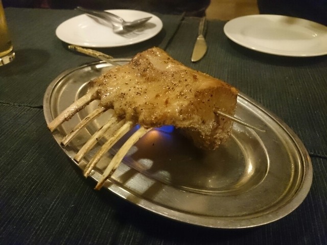 仔羊のお肉は燃えながらテーブルに