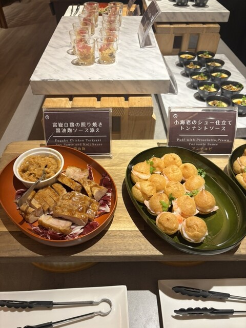 発酵ブッフェ 鮪のピリ辛ソースガーリック添え かぼちゃの豆腐金山寺麹オイル 鯖のカルパッチョ 富嶽白鶏の照り焼き醤油ソース添え 生ハムと発酵りんご などなど